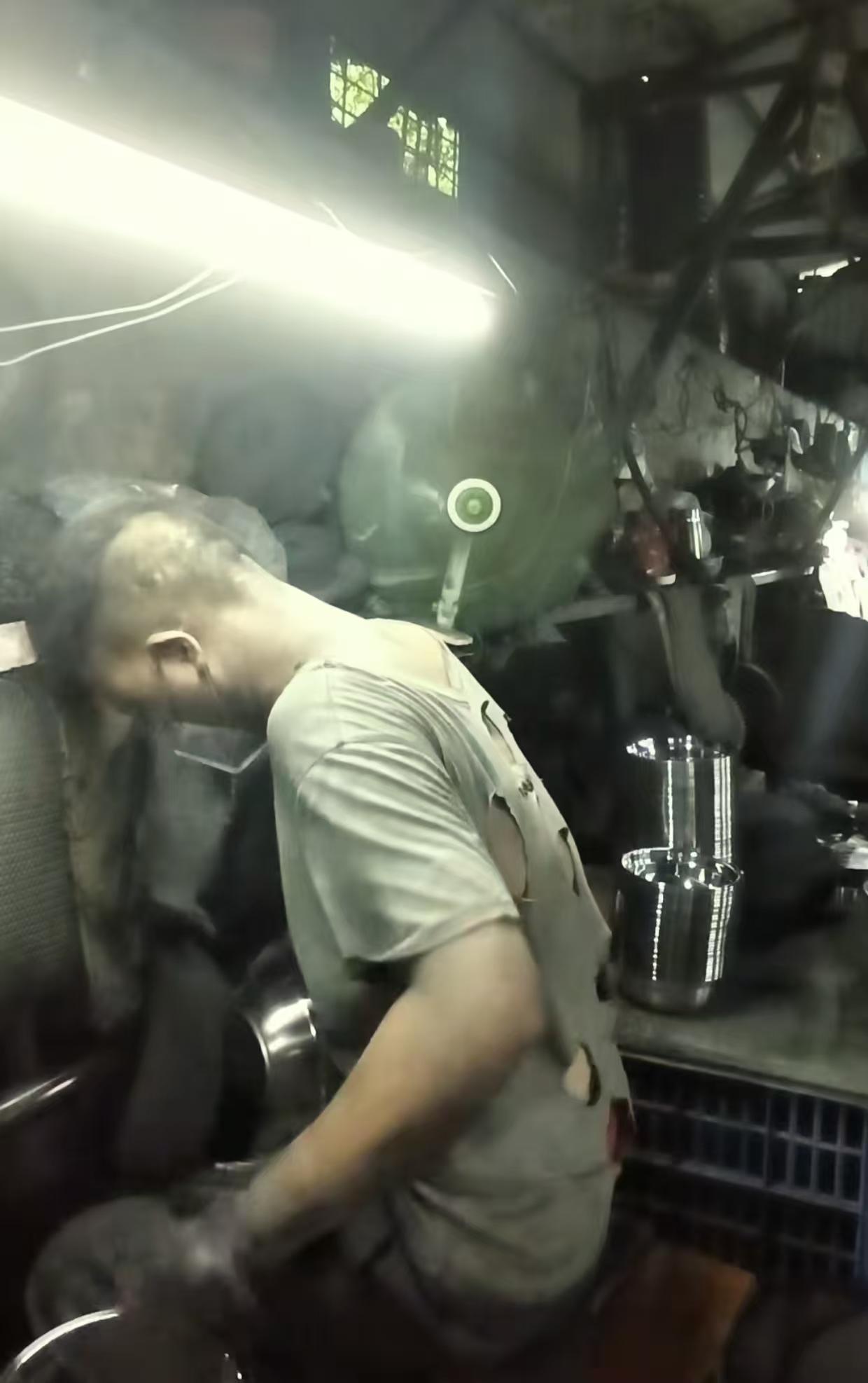 机器轰鸣、火花四溅,有工人将待加工的不锈钢盆放入机器中抛光,直至打磨平滑,随后放入另一个盆,如此循环,视频中工人的衣服、面部被染黑,有男工人因太热选择脱掉上衣……